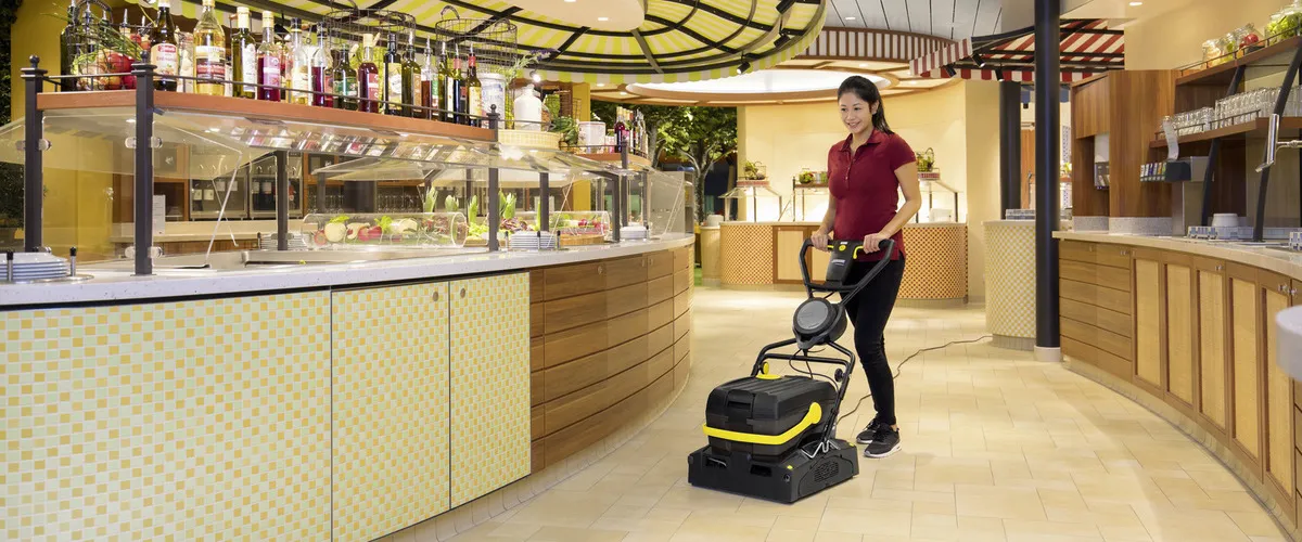 Kärcher strojevi za ribanje i sušenje, poput profesionalnog B 110 R modela, koriste precizno doziranje vode (eco!Flow funkcija) gdje se prilagođava protok vode brzini vožnje.