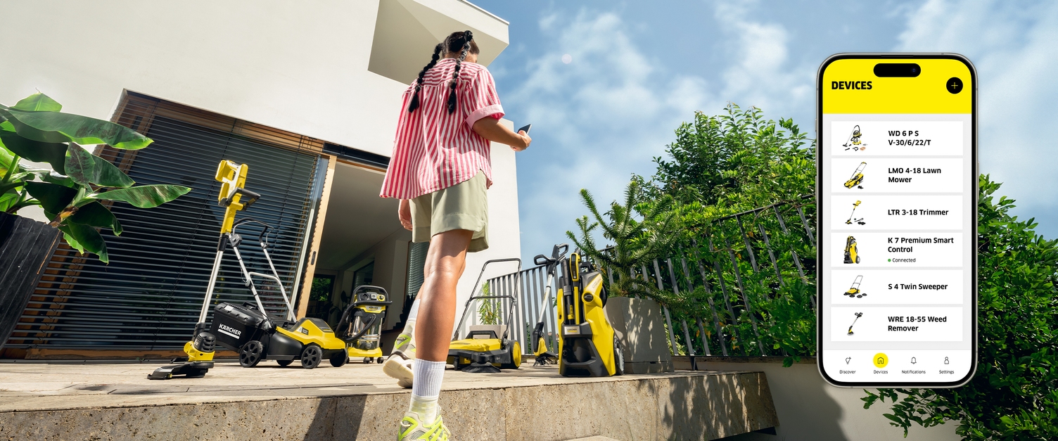 Whether you need to remove dirt from your bike, clean the patio, spruce up the car or clean the bathroom and floors – the Kärcher Home & Garden app makes everything easier. Not only can the app be used to control Kärcher products with smart functionality, but it also provides step-by-step support for the initial startup of new devices. It also provides access to many other services as well as our extensive Kärcher cleaning expertise. Here you will find instructions for tackling any cleaning problem, tips for getting the most out of your own products and advice on how to gently yet effectively restore the WOW factor to favourites.