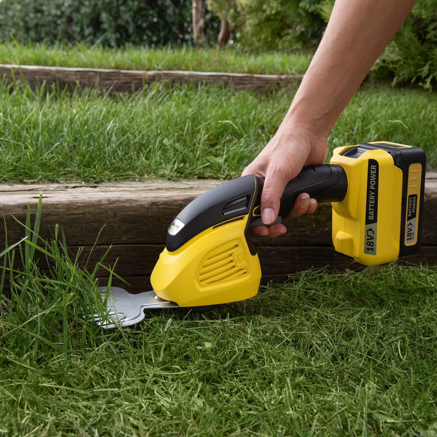 The compact 2-in-1 helper: The battery-powered grass shear is used for trimming lawn edges around the house, flower beds, vegetable gardens, or the patio, and the shrub shear makes shortening and shaping shrubs a breeze.