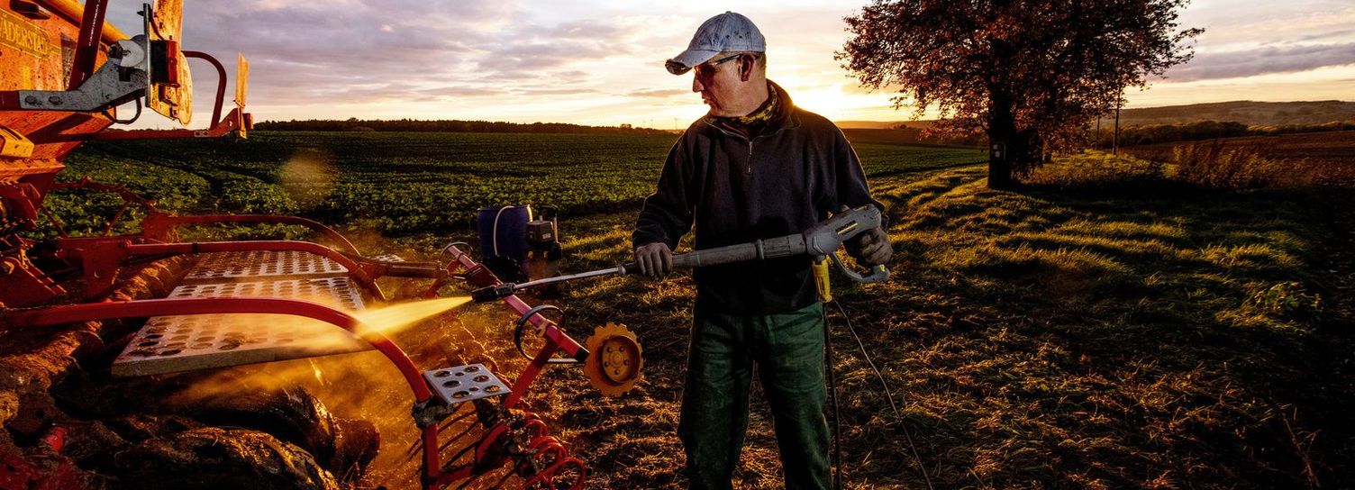 Cold-water pressure washers used without cleaning agents are now common parts of cleaning work done in the field. Combustion engine models are well suited to this purpose. This is due to the need to run independently of the energy grid and the high cleaning performance required to remove large quantities of dirt. You will also need a water tank, such as a water barrel for a tractor with front hydraulics or an on-site water supply in the field.