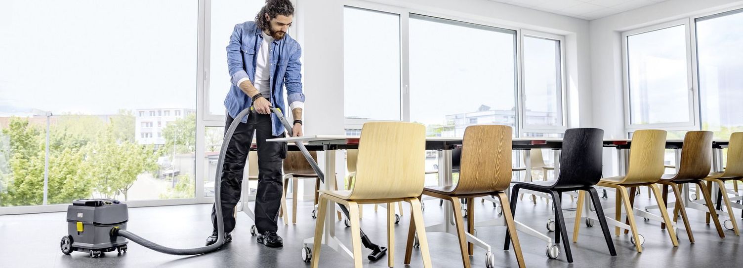 Kärcher dry vacuum cleaners are in continuous use in hotels, offices, retail and by professional building service contractors and eliminate all common forms of dry dirt. This includes loose dust, dust bunnies and hair. Our commercial cylinder vacuum cleaners help to make daily maintenance cleaning economical with sophisticated technology and high quality. They are compact and quiet machines that allow you to easily tackle a range of cleaning tasks – the machines impress with their high area performance and flexibility, and are also available in battery-powered versions. This allows you to also clean noise-sensitive areas, different floor coverings, areas with a low underride height and areas filled with objects and furniture – either for cleaning specific spots or the entire area. Moreover, the dry vacuum cleaners are used for dusting lamps, furniture and walls.