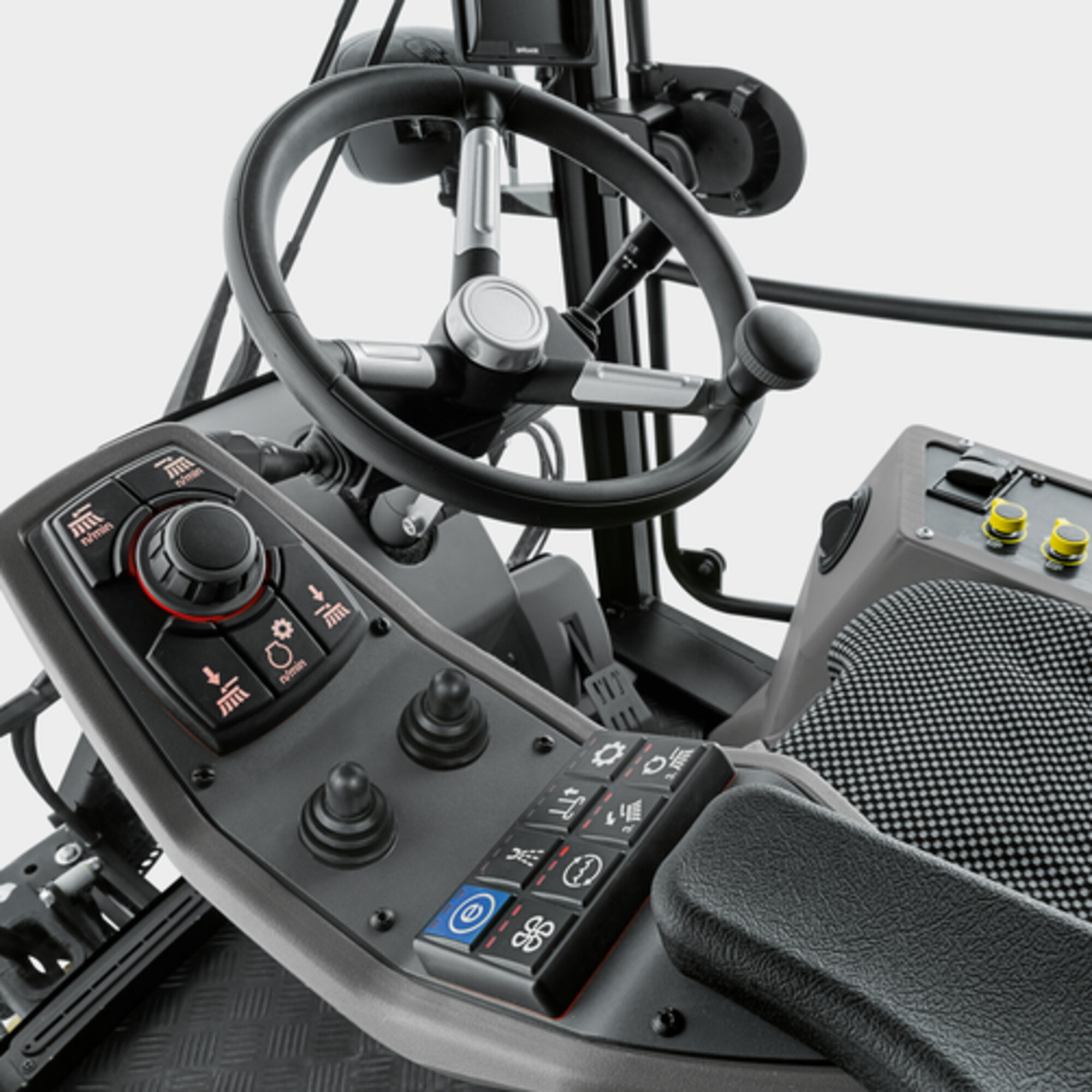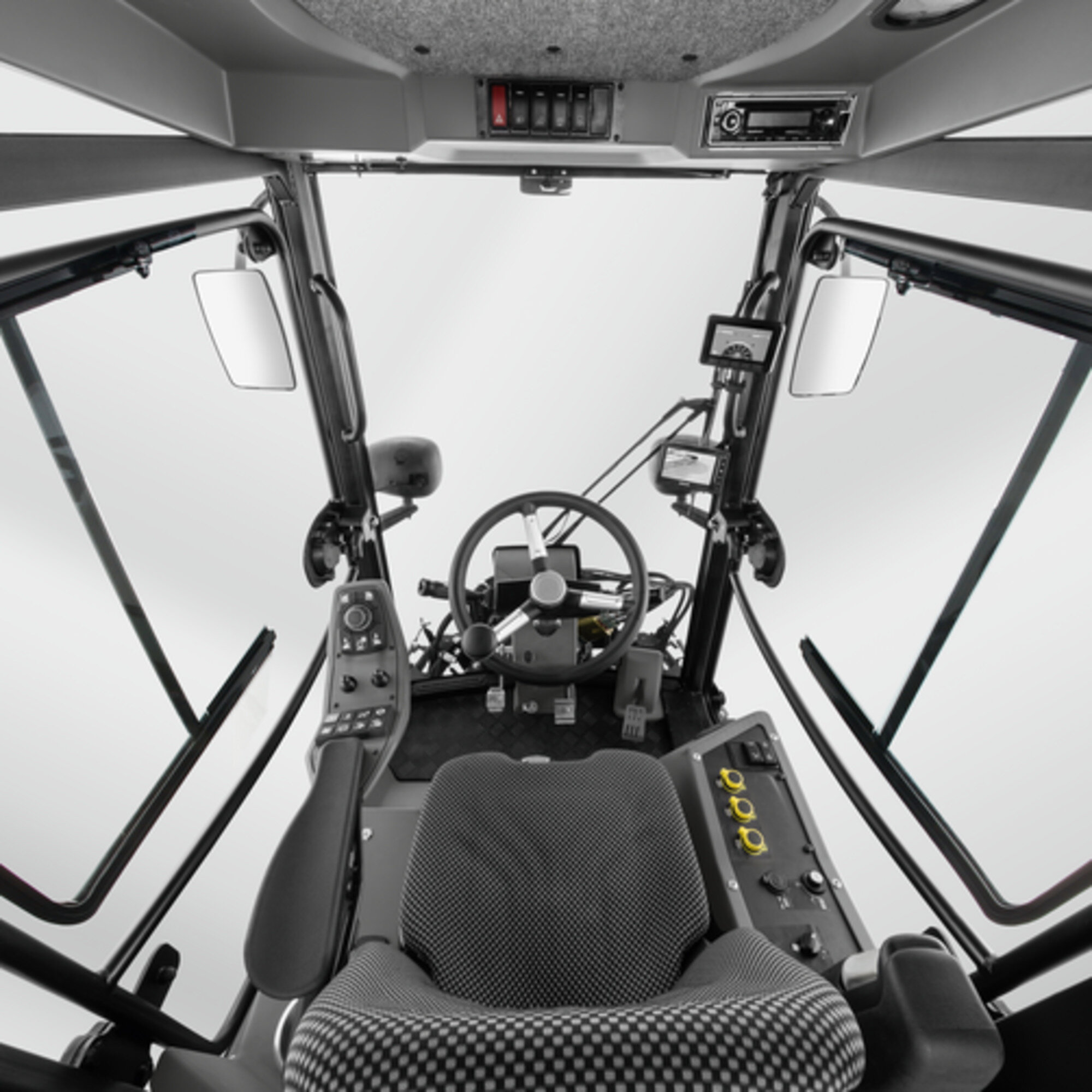 Largest cab in its class with 360° panoramic view, ergonomic and transparent. Windows on both sides, lockable storage compartment, USB charging port, bottle holder. Entry and exit on both sides for maximum flexibility when working.