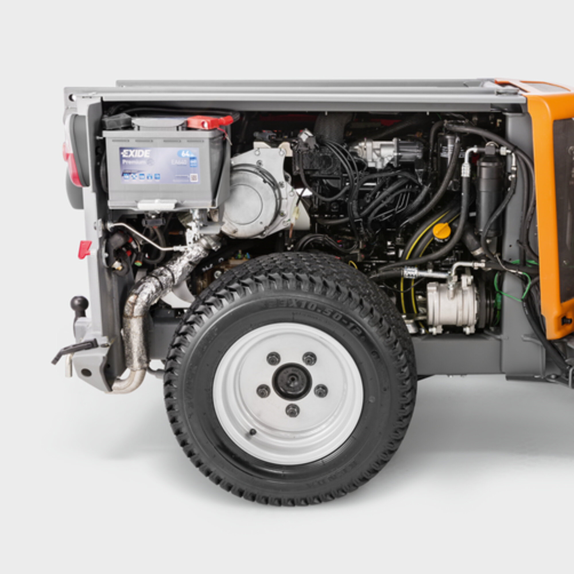 Easy-to-assemble two brush system with individual control and lifting. 800 litre container for swept material with water circulation system and 185 litre fresh water tank. Optional attachment kits available such as 3rd side brush or weed brush.