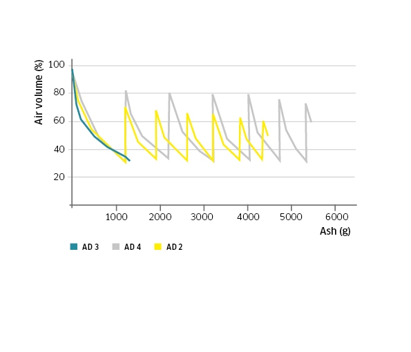 The one-piece filter system, including metal coarse dirt filter and flame-resistant flat pleated filter, can be removed in one move without the ash and dust falling out.