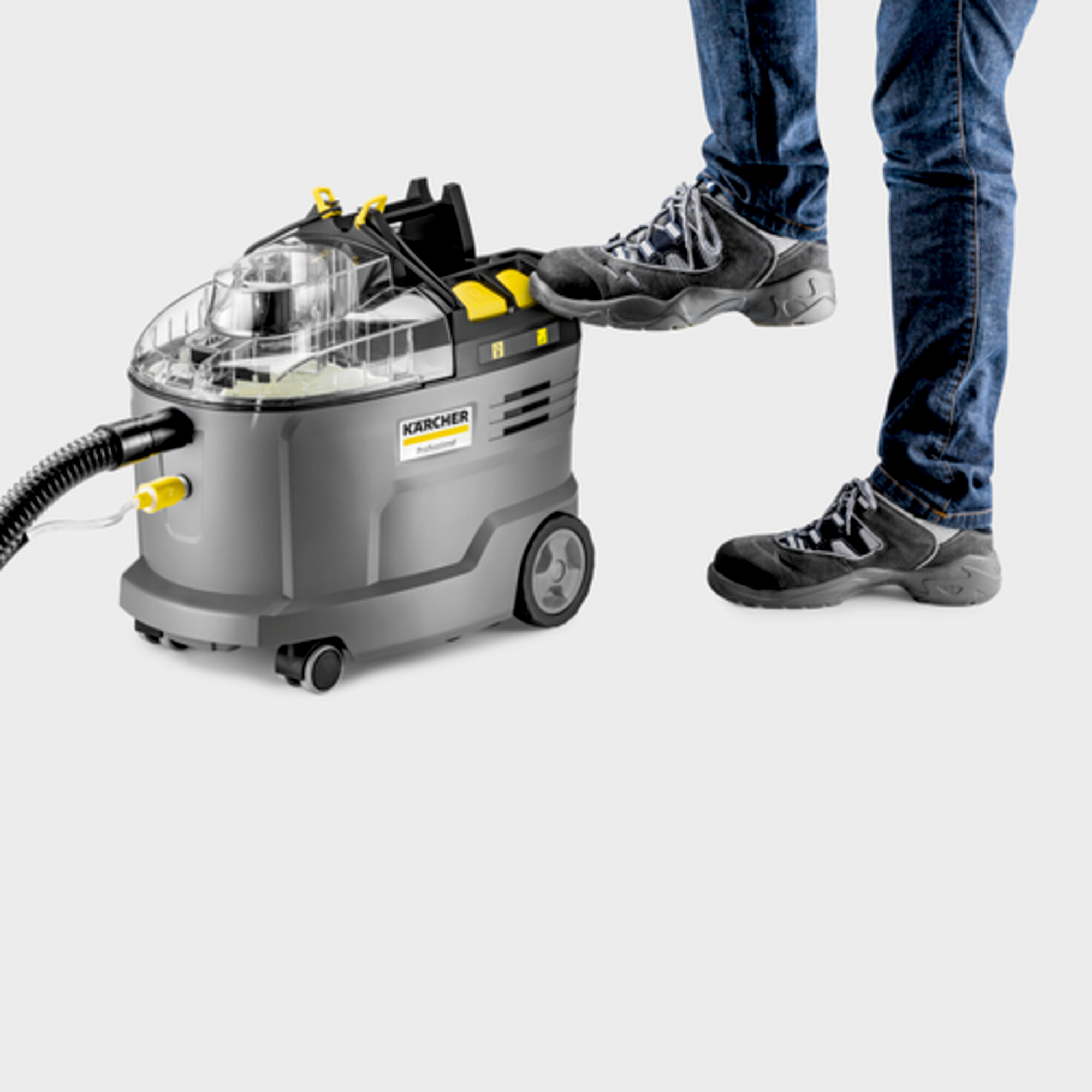 The only one of its kind in the world, offering an extremely robust design and cordless flexibility: Our Puzzi 9/1 Bp Adv Pack cordless spray extraction cleaner. As the only professional-standard battery powered spray extraction machine on the market, this Puzzi never fails to impress with its exceptional performance and maximum freedom of movement when deep-cleaning upholstery, carpets and other textile areas in any industry, be it hotels or hospitality, vehicle valeting or building cleaning operations. Despite its power, this Puzzi is extremely quiet, making it ideal for use in public areas: plus its ergonomically designed handle means it can easily be carried around one-handed. For best cleaning results, the cleaning solution is pressurised and sprayed deep into the textile fibres, then sucked back up together with the loosened dirt. When ordering this machine version, please bear in mind that the powerful 36 V Kärcher Battery Power+ battery and the corresponding fast charger must be ordered separately.