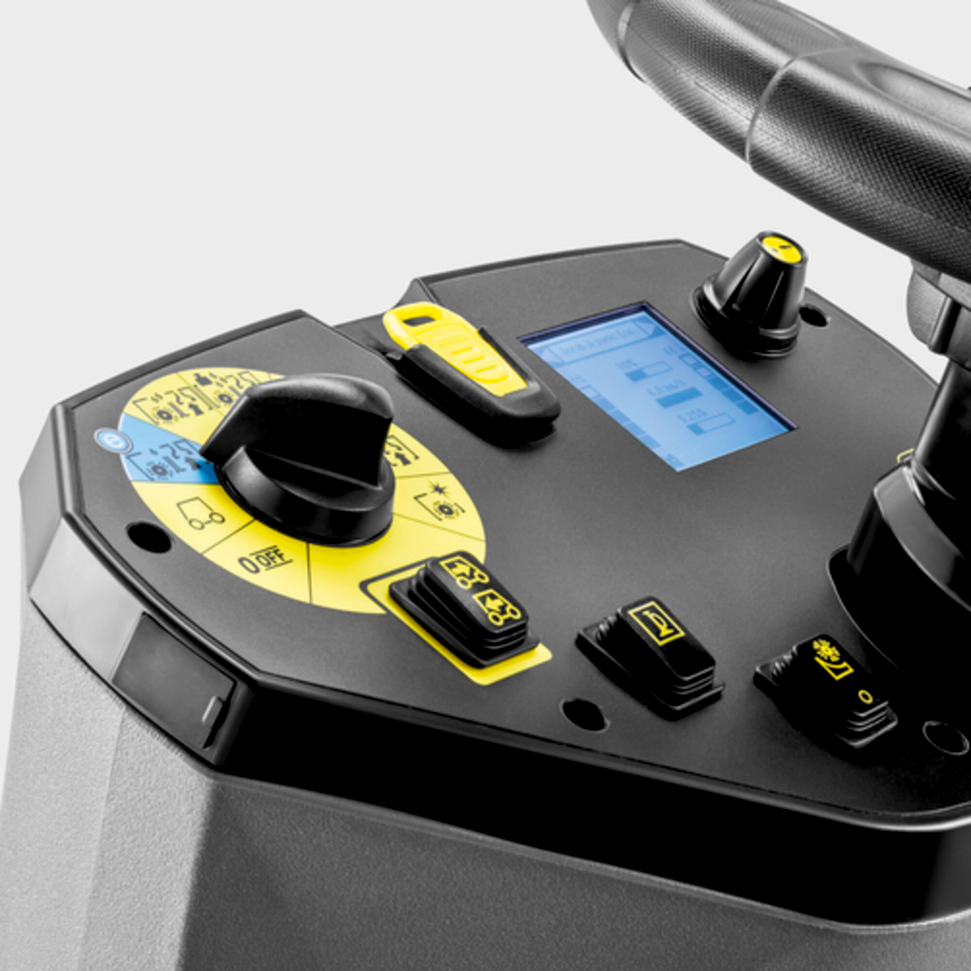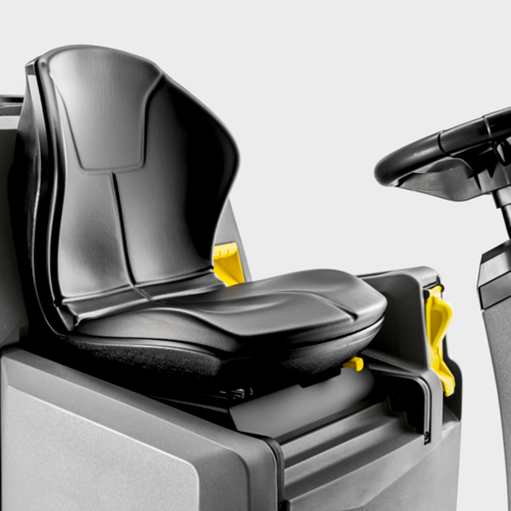 Ride-on scrubber dryer B 110 R with 110 litre tanks, DOSE cleaning agent dosing system, 2 disc brushes, as well as 170 Ah battery along with built-in charger.Drive type | Battery |