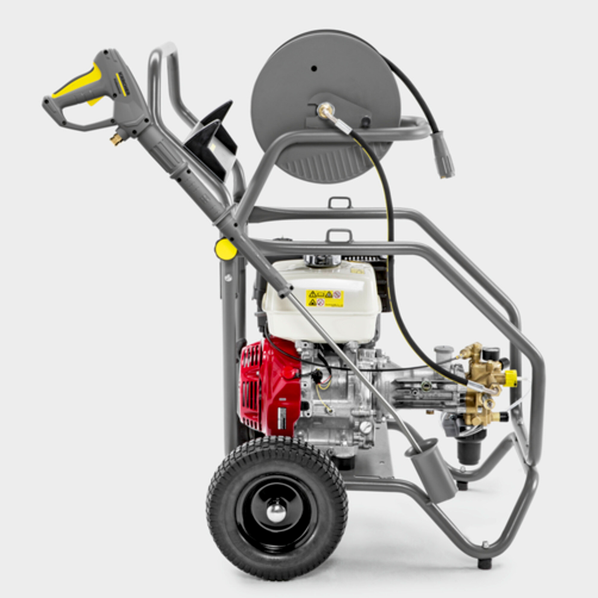 The ergonomic frame concept of the HD 9/21 G petrol-powered cold water pressure washer from the offers a high level of mobility. Protected by its stable frame, the machine can withstand adverse external conditions. The Honda petrol engine can reliably deliver electricity where no connection is available. And if a water connection is also unavailable, the machine is able to suck up water directly from lakes or ponds and convert it into a working pressure of 210 bar. So the pump does not overheat when in recirculation mode, the machine features a thermostat valve and a large water filter. The EASY!Force high-pressure gun, makes use of the recoil force of the high-pressure jet to reduce the holding force for the operator to zero, also the EASY!Lock quick-release fasteners, make set-up and dismantling five times faster than with conventional screw connections. The HD 9/21 G also impresses with its well-designed operating concept, storage options and puncture-proof wheels which guarantee mobility. We offer you expansion options, for example the attachment kit for a hose reel and an additional cage frame which features eyelets to facilitate loading onto a crane.