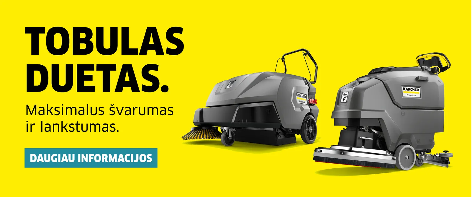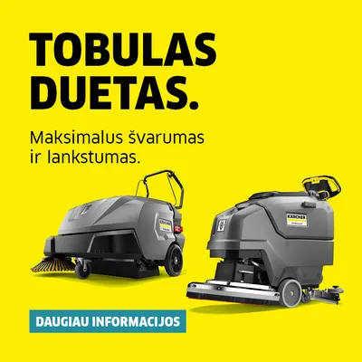 Mes, būdami didžiausi pasaulyje valymo įrenginių gamintojai, suprantame, kad bet kur pasaulyje esantys profesionalūs klientai turi atlikti specifines valymo užduotis. Mes taip pat suprantame, kad valymas - tai būtinybė, kuriai dažnai skiriama mažai laiko. Štai kodėl mūsų profesionalams skirtų valymo įrenginių, priedų ir valymo priemonių asortimentas yra sukurtas taip, kad patenkintų klientų poreikius. Nepriklausomai nuo verslo tipo ar vietos, naudojant Kärcher produktus pasiekiami puikūs valymo rezultatai, sutaupomas laikas ir ištekliai. Be to, šių produktų naudojimas yra intuityvus: todėl galima koncentruotis į svarbiausius verslo reikalus.