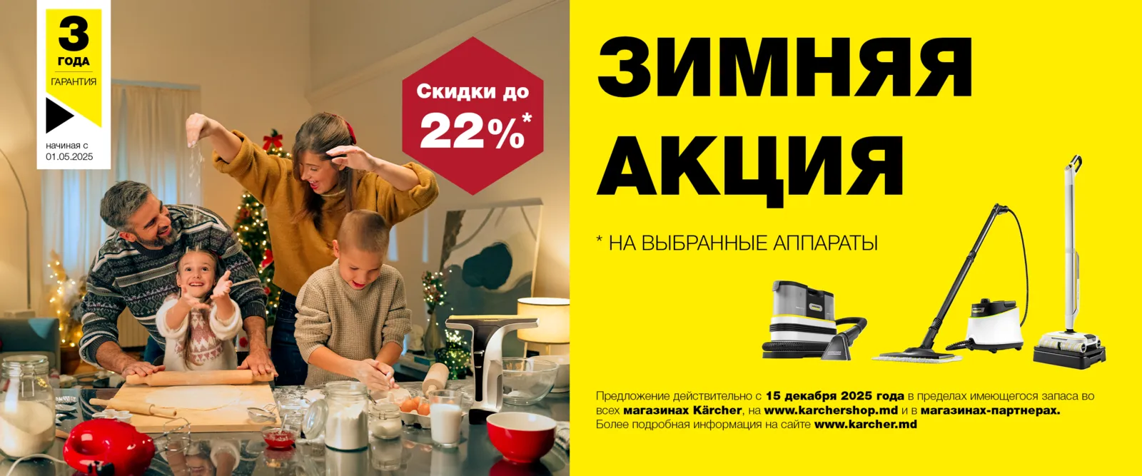 Kärcher объявляет Зимнюю Акцию на избранные аппараты! Воспользуйтесь возможностью приобрести идеальную технику для уборки со скидками до 22% и получить 3 года гарантии.