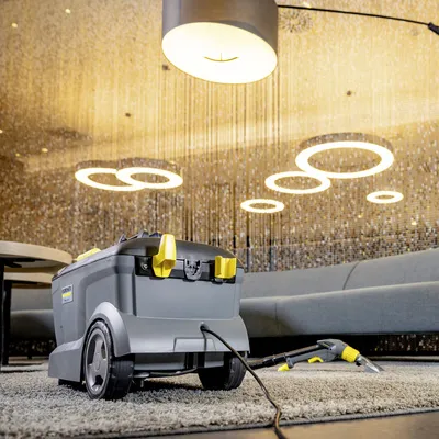 Po wstępnym odplamieniu czas przejść do właściwego prania dywanu metodą ekstrakcji. Wykorzystaj do tego profesjonalny odkurzacz piorący, np. urządzenie ekstrakcyjne (Kärcher Puzzi), które jednocześnie natryskuje na dywan roztwór środka czyszczącego i odsysa go wraz z brudem.
