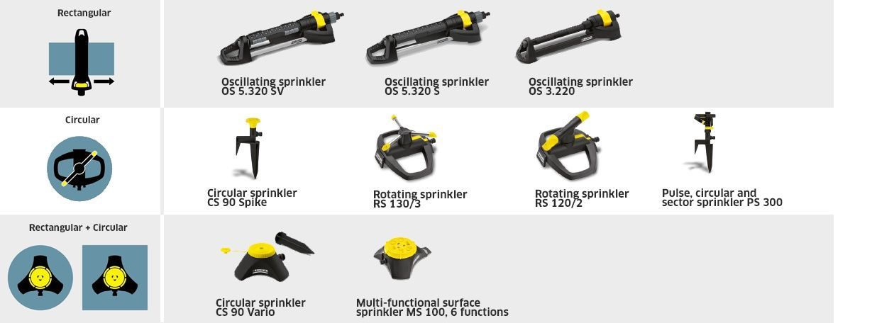 Para cada área de rega existe um tipo de aspersor adequado. Dependendo do tamanho, formato e características do jardim, é possível escolher o aspersor que melhor distribui a água, garantindo uma cobertura uniforme e eficiente. Assim, a água é aplicada exatamente onde é necessária, evitando desperdícios e assegurando uma rega eficaz das plantas e do relvado.