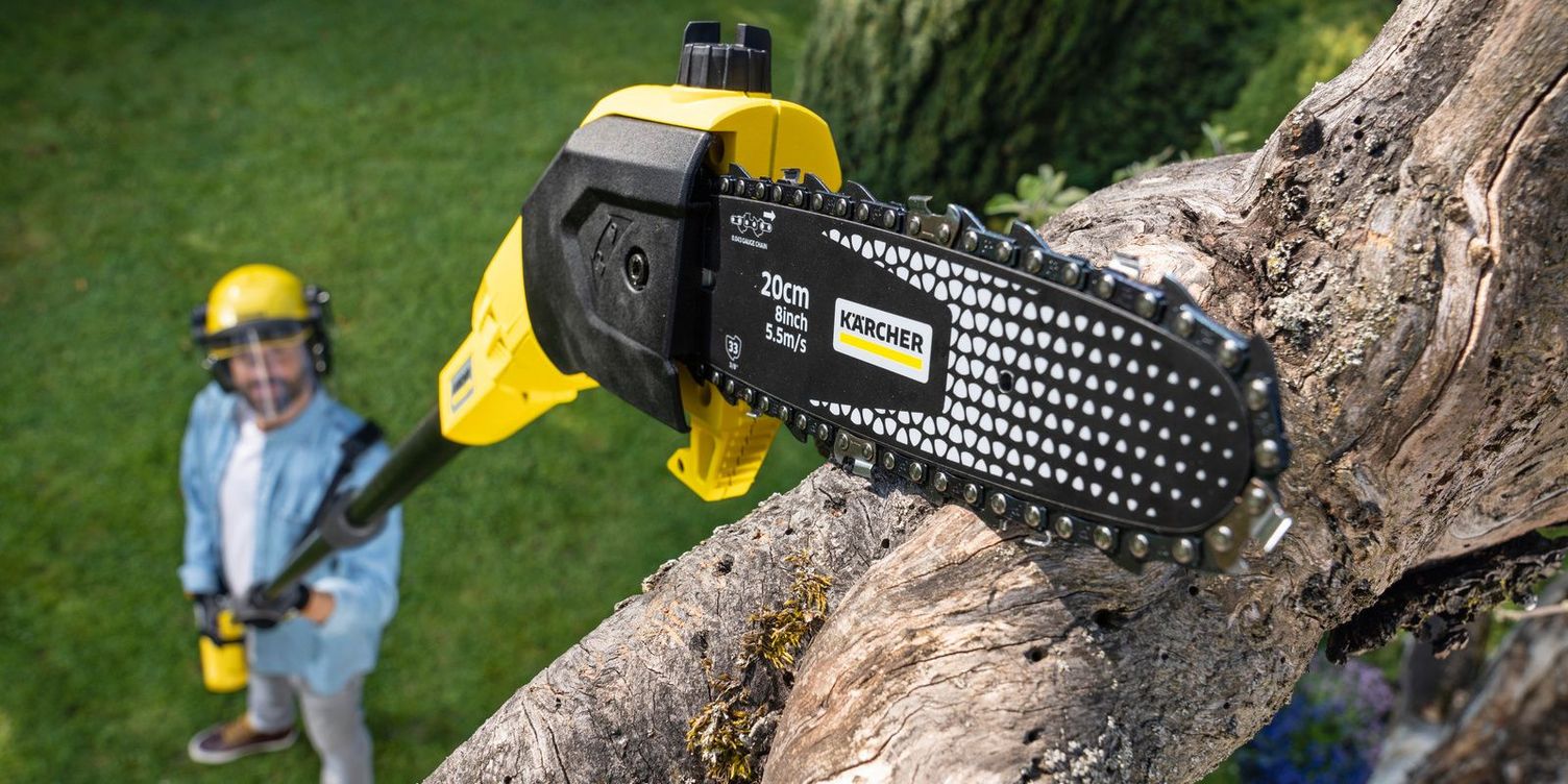 Where chain saws have a fear of heights, the battery-powered pole saw from Kärcher has a trump card. It can be used to saw easily and safely through branches up to 4 metres high that are difficult to cut.