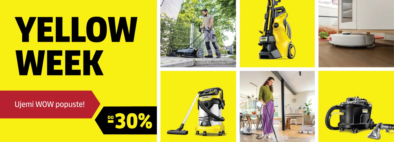 Čas je, da vaš dom in okolica zasijeta v polni moči. Izkoristite Yellow Week in si zagotovite vrhunske naprave Kärcher z ekskluzivnimi ugodnostmi. Ne glede na to, ali potrebujete visoki tlak za teraso ali baterijski sesalnik za notranje prostore, vas v naši ponudbi čakajo rešitve, ki delo opravijo hitreje in bolje.