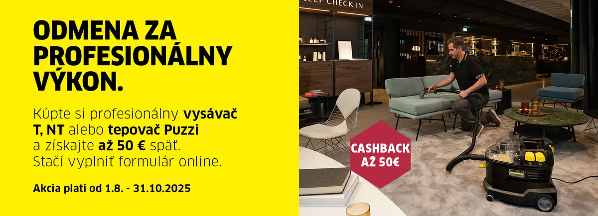 Nakúpte vysávače KÄRCHER rady CV, BVL, HV, EB, LVS, T, NT alebo tepovače Puzzi v období od 1.8.2025 do 31.10.2025 a získajte až 50 € cashback.