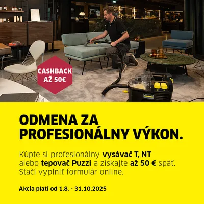 Odmena za profesionálny výkon! Získajte CASHBACK až 50€ pri nákupe profesionálnych vysávačov T, NT a tepovačov Puzzi