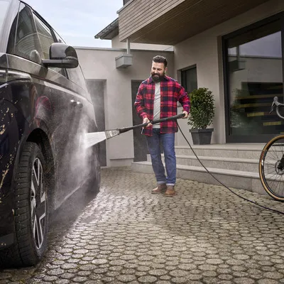 С телескопической распылительной трубкой вы можете добраться мойкой высокого давления до высоко расположенных поверхностей.